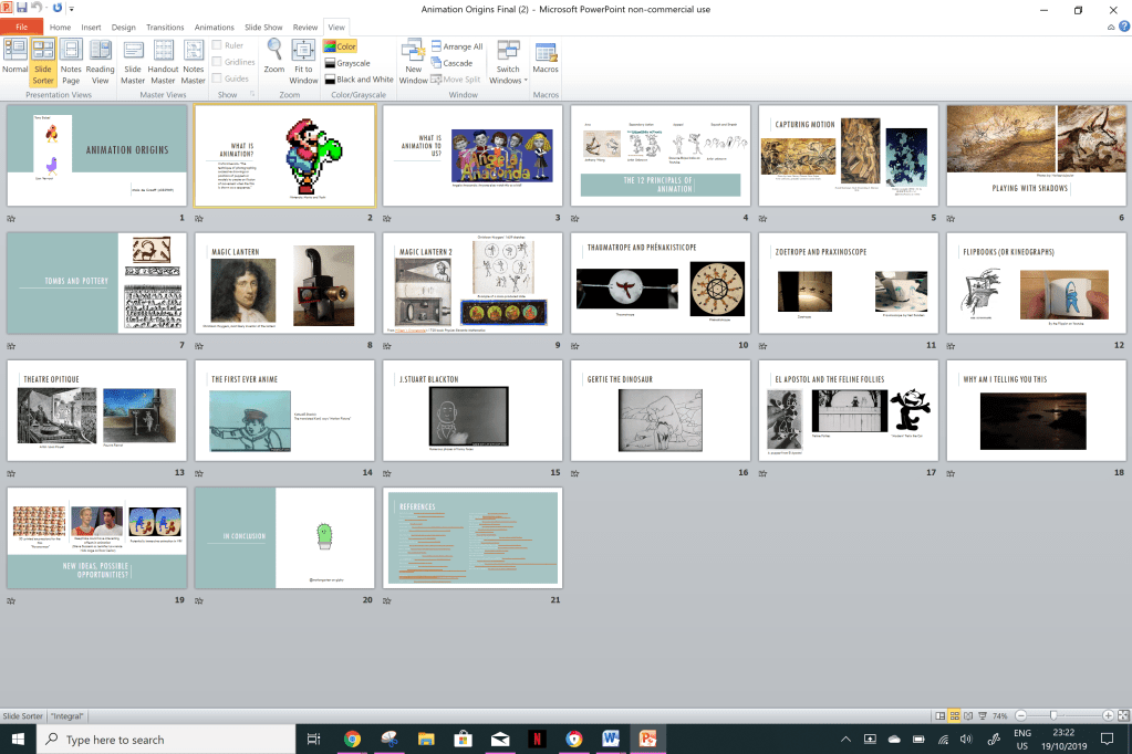 I’ve started to re-arrange my slides, as well as condense some subjects and expanding the outro and intro. I’m slowly writing the script, and leaving the visuals for more broad subjects (such as the intro and outro) until I’ve finalised it. I also want to work more on the layout of the actual images, and I’ve made some of the gifs smaller, as the large size of them would make the PowerPoint seem crowded and stuffy. So now I just have to focus on finishing up the script and polishing the visuals, as well as practice the speech to make sure it fits into the 20 second time. I’ve also decided not to personally animate examples, as it would take too long and I am not confident in my abilities to rush it out.