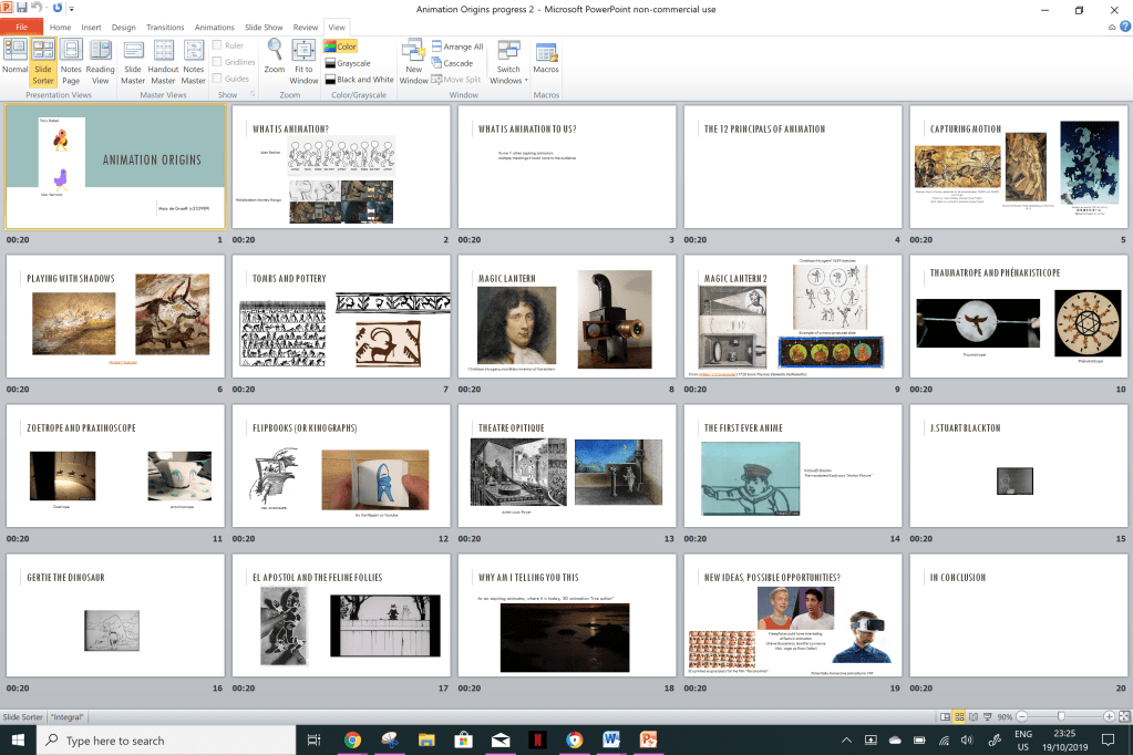 The subject I chose to do for my Pecha Kucha is the early history of animation. Initially I thought it would start with the rubber-hose style of animation common with early Disney. Pop-eye, Betty Boo p etc. However the history of animation went back much further than I thought which is really interesting. After briefly doing some basic research I threw together a table in Word with 3 columns labelled “Subject”, “Script” and “Images”. Then I put together a draft PowerPoint as seen below. I always wanted to include gifs to emphasise the points in the presentation, and I’m considering personally animating the little character from the blog interacting with the subjects in the topics I discuss. But that will mean a lot more planning and time, so for now it’s just an idea. I haven’t got a definitive script yet, just the points I’d like to go over and the visuals to support that. The feedback after showing my draft was that I needed to focus more on the introduction and conclusion, as the actual content seemed to drag on for a while longer than necessary. I also need to relate it more the audience and myself, by adding a more personal touch.