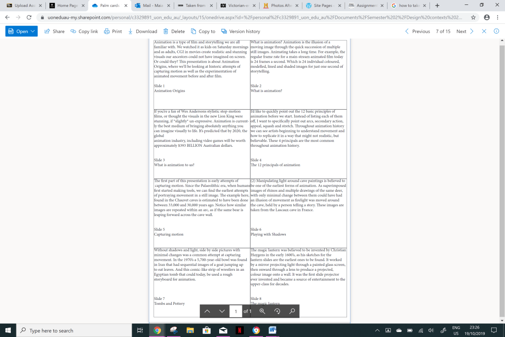 As seen below, I found that the PowerPoint template I’ve been using has its own layouts for how many images you have on a slide. This has made my layouts much more visually legible and interesting, as some slides even have a hierarchy- so thank you PowerPoint templates! I’m pretty happy with how the final product turned out, If I could go back and change anything I would try to practice the script more, and maybe reduce the amount content in my speech, because I think I might have to rush in some parts in order to keep up with the slides. Also, I put in how I made my palm cards, I copied the script I wrote in the Word document table and pasted it into the InDesign document to print out. The final Word document table has six coloums, “Slide number”, “Subject”, “Points”, “Script”, “Visuals ”,“ Script and References.